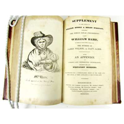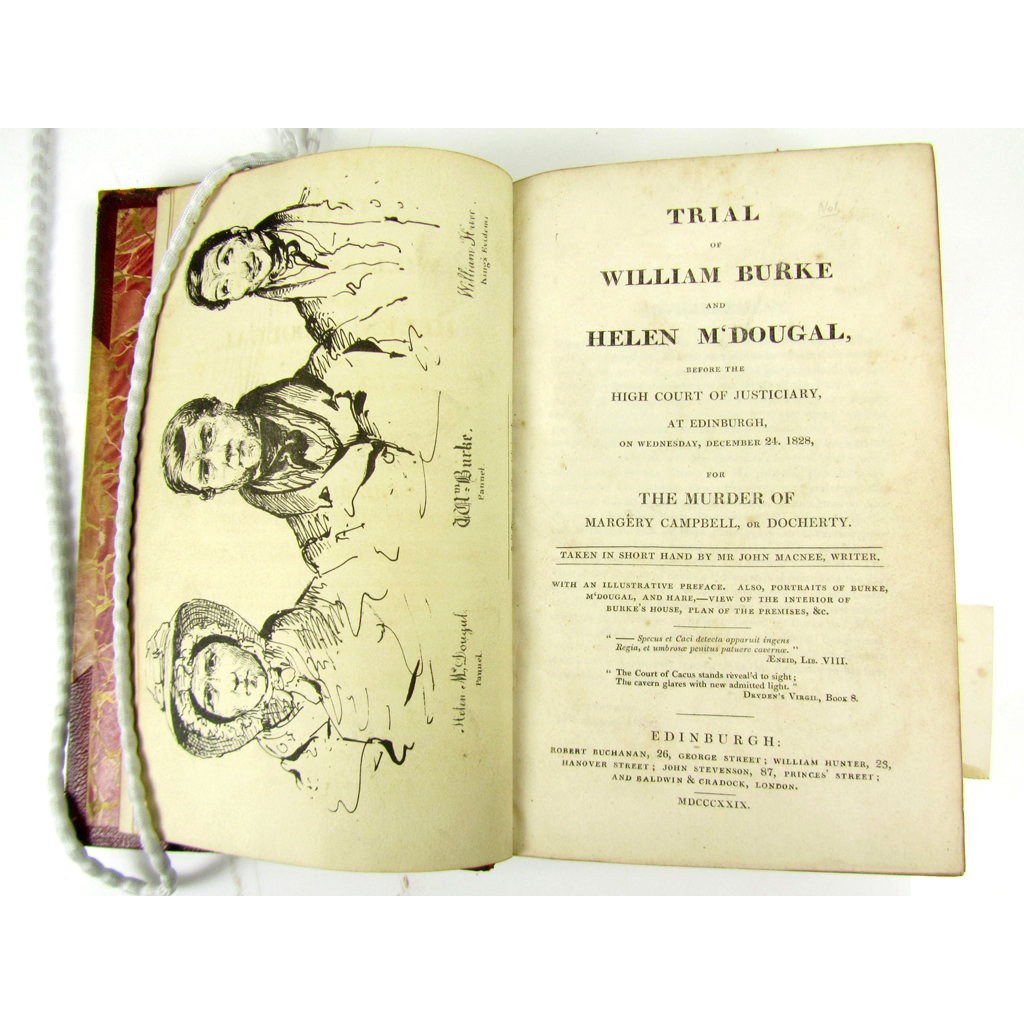 Trial of William Burke and Helen M'Dougal, before the High Court of Justiciary, at Edinburgh, December 24. 1828 for the Murder of Margery Campbell or Docherty. [& Supplement]. Edinburgh: R. Buchanan [&c.], 1829. 8vo, 2 parts in one volume, 2 lithographed frontispieces, maroon half morocco, some spotting, rubbed; Roughead, W. Burke and Hare. 1921. First edition, 8vo, limited to 250 copies, original cloth, t.e.g.; MacGregor, George The History of Burke and Hare. 1884. 8vo, plates, original cloth, slightly rubbed (4)