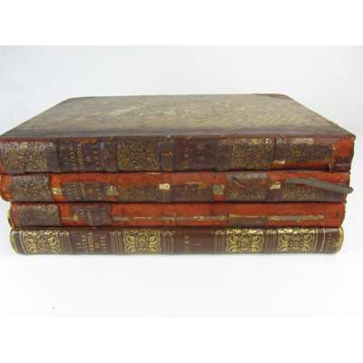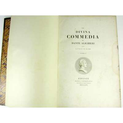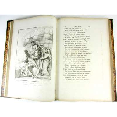 La Divina Commedia. Florence: nella Tipografia all'insgna dell'Ancora, 1817-19. 4 volumes folio, 124 engraved plates by G. Masselli and E. Lapi after F. Nenci & Luigi Adamolli, , contemporary half calf, slight spotting, small dampstain in some fore-margins of volume 2, armorial bookplates, hinges renewed, bindings of volumes 2-4 worn, volume 1 neatly rebound in half morocco