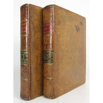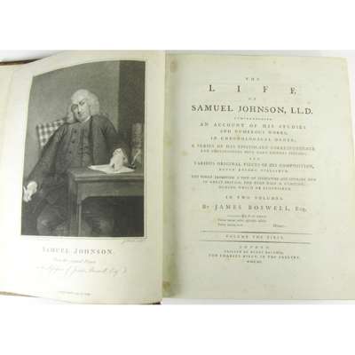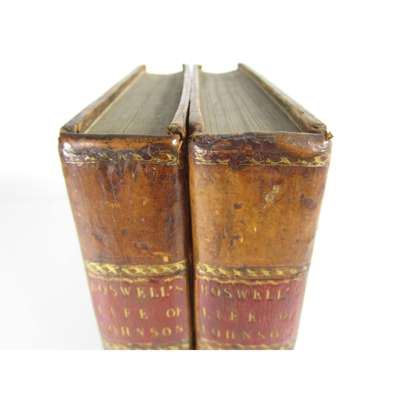 The Life of Samuel Johnson, L.L.D. London: Charles Dilly, 1791. First edition, second issue reading "give" on p.135, line 10, volume 1, 2 volumes, 4to., engraved portrait frontispiece and 2 engraved plates, contemporary calf, bookplate of Jn. Larking, 19th century inscription on endpaper of Ambrose Warde, some spotting, joints neatly repaired but cracking, neat repair to head of spines