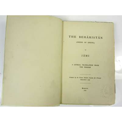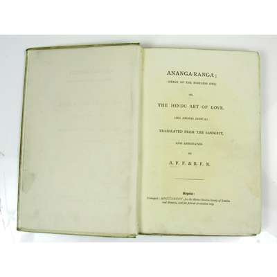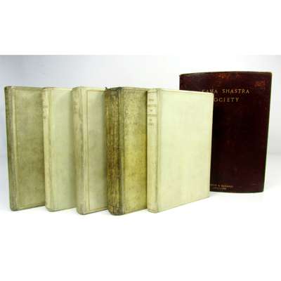 The Kama Sutra of Vatsyayana, translated from the Sanscrit, 1883; Ananga-Ranga (Stage of the Bodiless One) or the Hindu Art of Love. 1885; The Perfumed Garden of the Cheikh Nefzaoui. 1886; The Beharistan (Abode of Spring) by Jami. 1887. First edition, first issue; The Guilistan or Rose Garden of Sa'di. 1888. First edition, first issue; all "Cosmopoli", or Benares, for the Kama Shastra Society of London and Benares, and for private circulation only, all vellum bindings, uncut, 8vo, all contained in contemporary maroon morocco case with lock (key not present) lettered in gilt "Kama Shastra Society, London & Benares 1883-1888, The Perfumed Garden rather soiled and rubbed, four volumes with blindstamp to title page and final leaf
