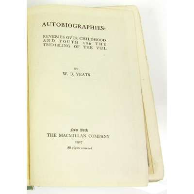 Autobiographies: Reveries over Childhood and Youth and the Trembling of the Veil. New York: The Macmillan Company, 1927. 8vo, number 17 of 250 copies signed by Yeats, portrait frontispiece, 4 plates, original quarter cloth, bookplate, ownership signature to endpaper, a little bumping, some cloth to spine torn