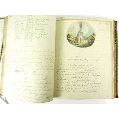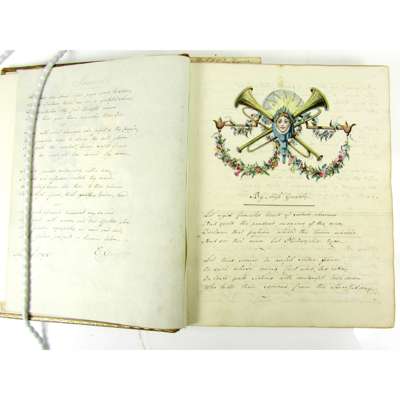 Manuscript book of collected verses, "Poems", c. 195pp. , 4to., compiled by Lady Anne Hamilton, daughter of Archibald Hamilton, 9th Duke of Hamilton, (book started in 1795, last poem written in 1833), comprising verses by Richard Brinsley Sheridan, Paul Whithead Esq., Frederick Howard 5th Earl of Carlisle, Anna Seward, Edward Lovibond, Matthew Gregory Lewis, Hugh Boyd, Lord Byron, with, loosely inserted, a French poem "Impression reçue au premier aspect de l'abbaye de Fonthill" with round watercolour of Fonthill Abbey, poems addressed to Anne Hamilton, 3pp. of notes at end on Edward Lovibon Esq., Miss C. Phillips, Miss Greenly, Newton Barton, Lady Ogle, Mr Mercer, &c., delightful watercolour title, contemporary calf gilt, lettered "A.H." at foot of spine, g.e., slightly rubbed