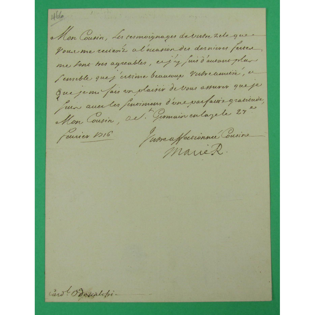 Note: Although James II had died in 1701, Mary of Modena survived until 1718. In this letter of 27 February 1716, not long after the rebellion failed, Mary writes to her cousin, Cardinal Odescalchi, concerning a recent festival and appreciating his friendship. His friendship was undoubtedly of importance to her at this time, just three months after her son's defeat.