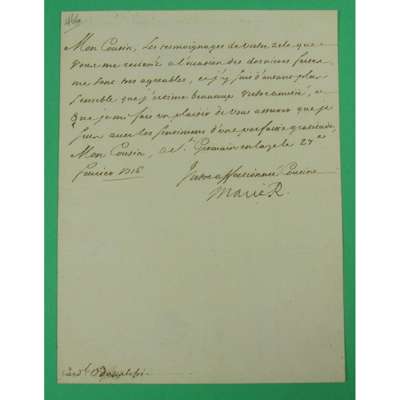 Fine Letter, signed in French, to her cousin, Cardinal Odescalchi, expressing her pleasure at receiving "further confirmation of your regard for me on the occasion of the recent festival and such regards is particularly precious in that I respect your friendship highly...", 1 side 4to., with integral address leaf with two fine impressions of her seal, St. Germain-en-Laye, 27th February 1716