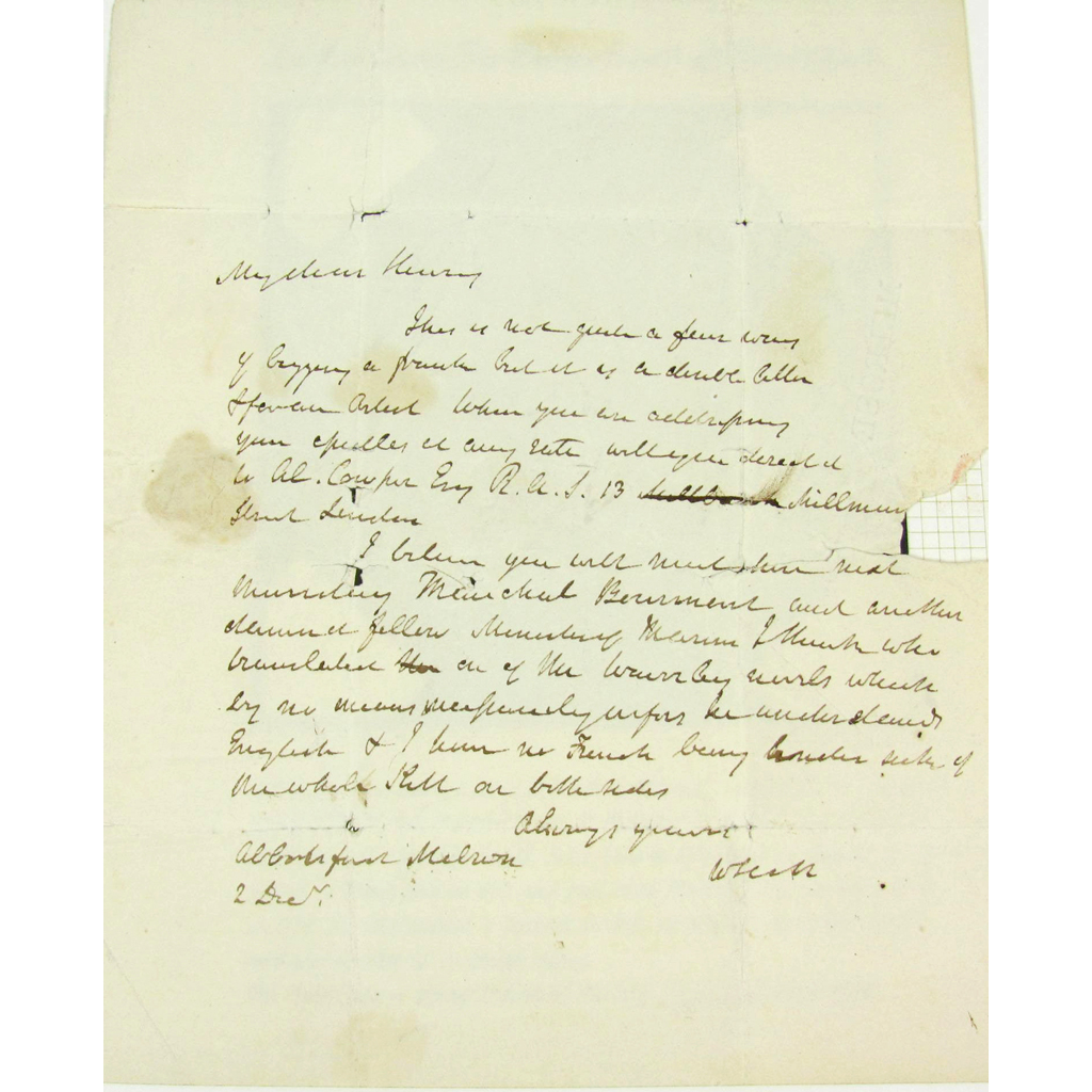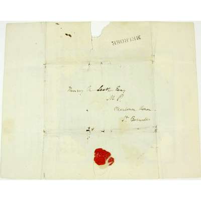 Autograph letter signed from Sir Walter Scott to his cousin Henry A. Scott, regarding the visit of Mareshal Bourmont and Baron d'Haussez to Abbotsford in 1830, Abbotsford, 2nd December [1830], c.23 x 19cm, written on one side of plain notepaper with address, broken seal and postmark displaying a straightline of Melrose, a couple of small tears, c.1" tear to right side with slight loss to text