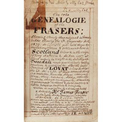 854 manuscript pages (including a few of blank leaves), probably 18th century, containing genealogical histories of various clans, including: The True Genealogie of the Frasers... written in one volum [sic.] by a ? of ? & Antiquity Mr James Fraser... minister of Kirkhill... 1666...; The Genealogicall Account of the Ancient Family of the Crawfords of Kilbirnie... By Geo. Crawfurd; The Genealogicall Account of the Familie of ye Lord Forbes... compiled by Mr Matthew Lumsden of Fillikernie?, 1580; The Genealogicall Account of the Family of Skein by Mr Alex Skein..., 1678; The Genealogie of the most noble and ancient house of Drummond... By A Friend to Virtue & the Family viz. Sr William Drummond of Hawthornden... Collected in the year 1681, modern half calf, 8vo, 16 x 10 x 5cm