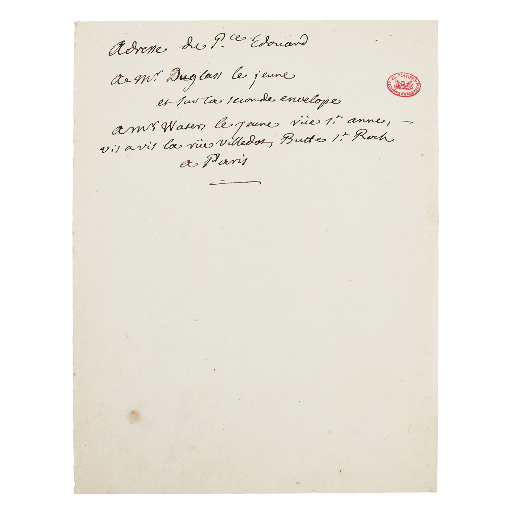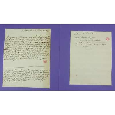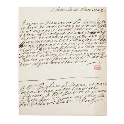 Autograph letters, unsigned, from Charles to the Comte d'Argenson, Louis XV's Minister of War, 1p and 1/2p., 4to, Paris, 27th March 1747, giving an address and false name for communications and asking the Count's address, the bearer is Monsieur Sheridan (nephew of Sir Thomas Sheridan) who can be trusted to follow any instructions (2)