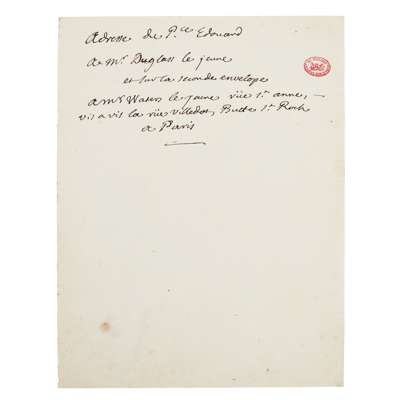 Note: Under constant surveillance from British government agents, Charles was used to conducting diplomatic negotations in a cloak-and-dagger atmosphere, here using the address of John Water & Son, Paris bankers to the Stuarts. The context of these notes, unsigned for obvious reasons, is explained in a letter to his father of 10 April, now in the Stuart Papers: "I have received a civill note from Count d'Argenson in which he desiers I should give him an address by which he can always be able to communicate to me his masters pleasure without its ever being suspected, which I did, giving him a cant name to be sent under cover to Waters jounior, so that everything is at their door." (Quoted by David Daiches, Charles Edward Stuart, 1973).