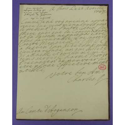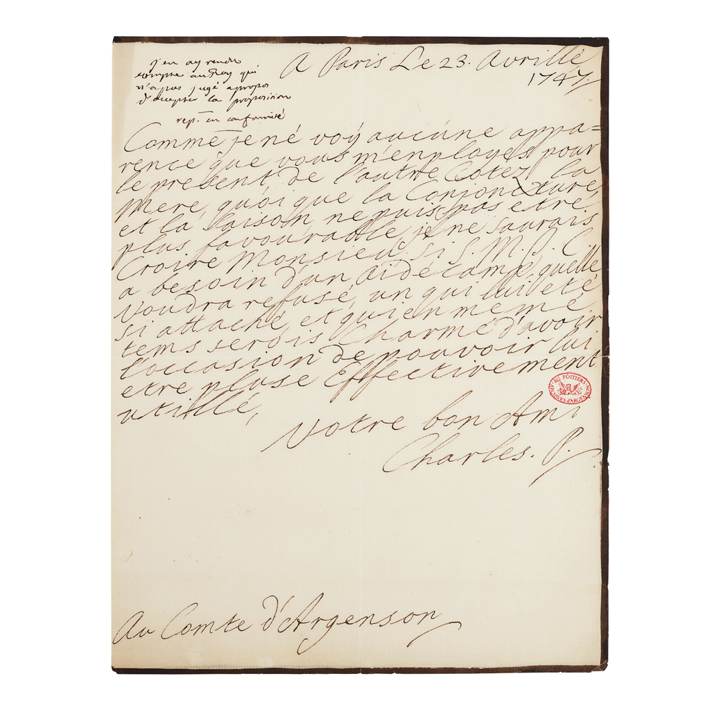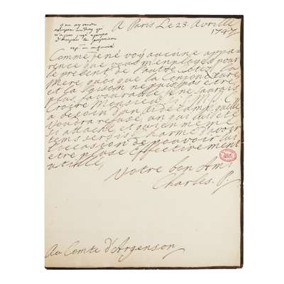 Autograph Letter Signed, to the Comte d'Argenson, Louis XV's Minister of War, Charles stating that he is despondent that he sees no prospect of action across the water and offering his services as aide-de-campe to King Louis XV, endorsed in the top margin by d'Argenson noting that the King declined the offer, 1 page, bifolium, Paris, 23 April 1747