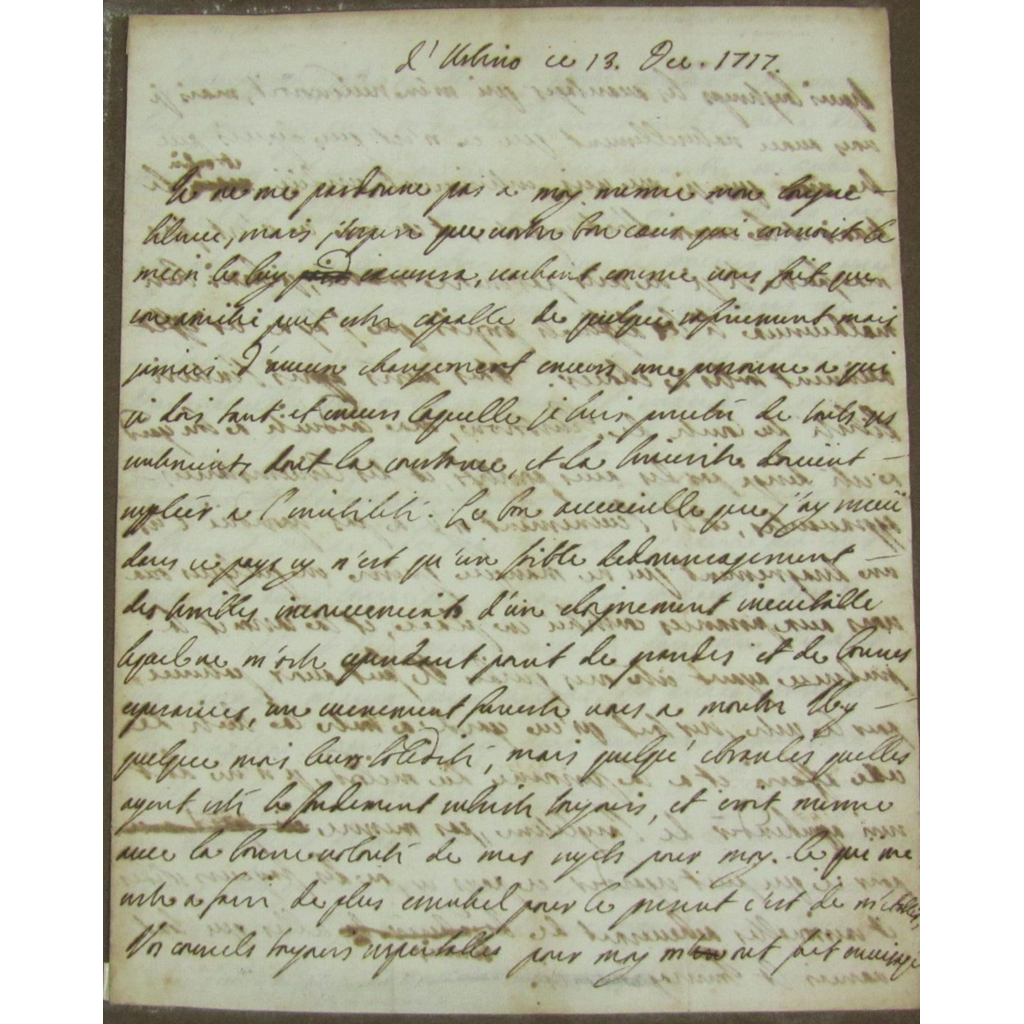 Autograph letter initialled, Urbino, 13th December 1717, in French to an unnamed recipient referring to his situation in exile, the welcome he has received in Italy which had lessened the terrible inconveniences of the an inevitable distance, saying he need to get himself established and that "your always respectable advice for me made me forsee a long time ago the advantages that would return to me" saying that it is not his fault that he is still not married, saying that he will have learned of the complete freedom of the Comte de Peterbrou (?), then continuing to talk about the nature of his conduct towards the Count and how advice and circumstances prevented him from sorting out a disagreement of some kind, and how the people of Italy are solid and reasonable, and while in Rome he learned of things that were being done on his behalf which humbly touched him, looking forward to receiving news of the addressees family which is so dear to him, talking about the climate, etc., 3pp., minor toning to centrefold, 4to., tipped into a modern matted mount with protective paper sleeve cover