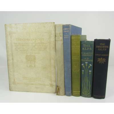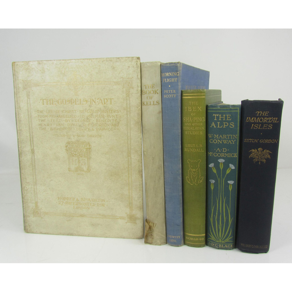 Rundall, L.B. The Ibex of Sha-Ping. London: Macmillan and Co., 1915. 8vo, original green cloth gilt; Conway, W. Martin - A.D. McCormick The Alps. London: Adam and Charles Black, 1904. 8vo, original pictorial green cloth gilt; Gordon, Seton The Immortal Isles. London: Williams & Norgate, Ltd., 1926. 8vo, original blue cloth gilt; Sparrow, W. Shaw, editor The Gospels in Art. London: Hodder & Stoughton, 1904. 4to, original Japanese vellum gilt; Sullivan, Sir Edward The Book of Kells. London: The Studio, 1920. 4to, original quarter Japanese vellum; Tissot, James J. The Life of Our Lord Jesus Christ. London: Sampson, Low, Marston..., 1898. Folio, original quarter Japanese vellum gilt, volume 2 only, worn; Scott, Peter Morning Flight. London: Country Life Limited, 1936. 4to, original blue cloth gilt; First World War Scrapbook containing 414 pp. of news clipping relating to the First World War, folio, album very worn; and 46 others, sold not subject to return (53)