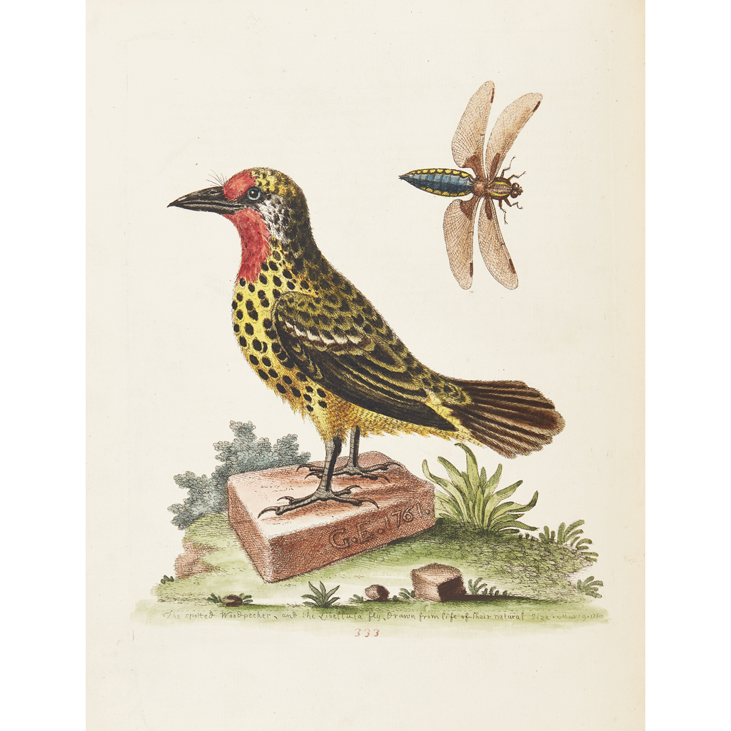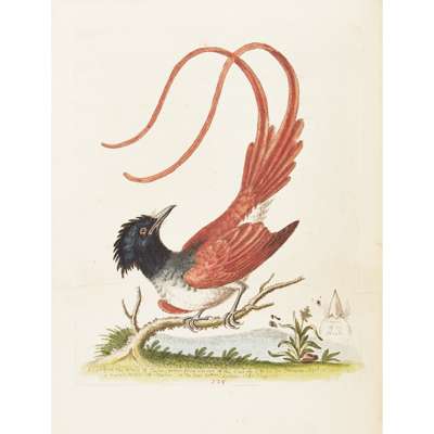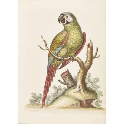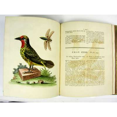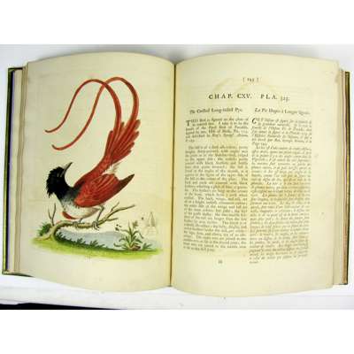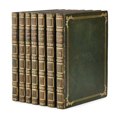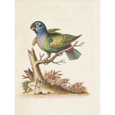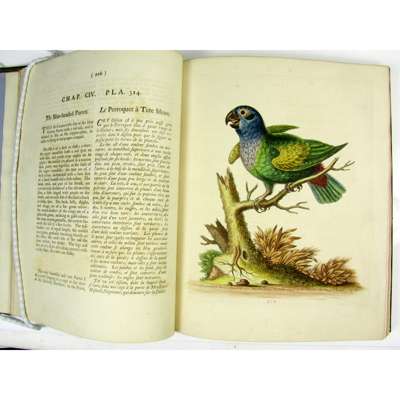 A Natural History of Birds; Gleanings of Natural History. Printed for the Author at the College of Physicians, 1743-64. 7 volumes, 4to., text of 'History' in English, 'Gleanings' in English and French, engraved portrait of Edwards in 2 states (one before the addition of "R.S.S." and "Nat. Mar. 23 April 3"), uncoloured plate of Samojeed, 362 fine hand-coloured engraved plates, some numbered in manuscript, plates 178 & 325 repaired, plate 175 probably supplied from another copy, bound without general title to first 4 volumes (as often with early sets), contemporary green morocco gilt by Charles Lewis, g.e., lavender endpapers, the William Gott copy with bookplates, minor wear [Nissen IVB 286-289; Fine Bird Books p.93]
