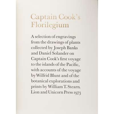 Captain Cook's Florilegium. A Selection of Engravings from the Drawings of Plants collected by Joseph Banks and Daniel Solander on Captain Cook's first Voyage to the Islands of the Pacific, with Accounts of the Voyage by Wilfrid Blunt and of the Botanical Explorations and Prints by William T. Stearn. Lion and Unicorn Press, 1973. Large folio, number 8 of 10 copies, a Subscriber's copy [Subscriber no 8, Dr. J.A. Watt], 42 engraved plates, text printed in purple, green, red, blue, brown and black, text and plates printed on Crisbrooke handmade paper, binding of Nigerian goatskin with solid gilt edges, designed by Joy Law, hand tooled in 22-carat gold leaf, with gilt stamps of Drosera uniflora from Tierra del Fuego as fleurons, and silk doublures by Zaehnsdorf Limited, with a specimen of Banksia integrifolia (plate 25), gathered at Botany Bay by R.G. Coveny in December 1973, encapsulated in acrylic by David Watkins as part of the upper cover, watered silk endpapers, in a green velvet lined folding green cloth box, morocco gilt lettering piece to upper cover, slight crystallisation at extreme edge of acryllic window, otherwise very fine
