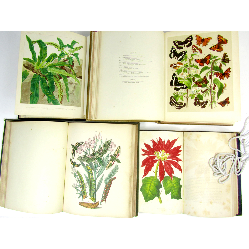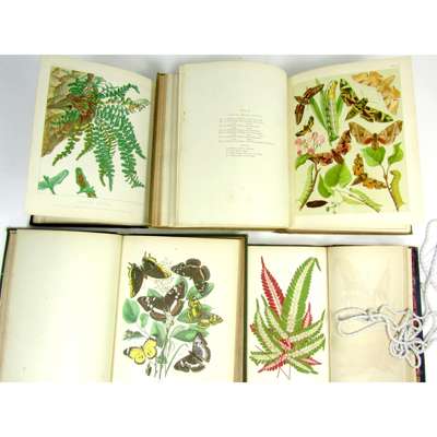 European Butterflies and Moths. Cassell, 1882. 4to, bound in 2 volumes, 61 hand-coloured lithographed plates, 1 uncoloured plate, later cloth, a few plates very slightly spotted, rubbed; Frohawk, F.W. Natural History of British Butterflies. Hutchinson, 1914. 2 volumes, folio, 60 coloured plates, original blue cloth, presentation inscription from R. and A. Waley Cohen to Wellesley House Library; Britten, James European Ferns. Cassell, [c.1880], 4to., 30 chromolithographed plates, tissue guards, contemporary black half calf, red morocco label, a trifle rubbed; Kirby, W.F. The Butterflies and Moths of Europe. Cassell, 1903. 4to., 54 coloured plates, 1 uncoloured plate, later buckram, rubbed, joint split; Lowe, E.J. Beautiful Leaved Plants. London: Groombridge, 1864. 8vo, 60 chromolithographed plates, tissue guards, contemporary blue half morocco gilt, t.e.g., a few plates slightly spotted, rubbed (7)