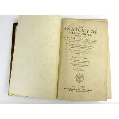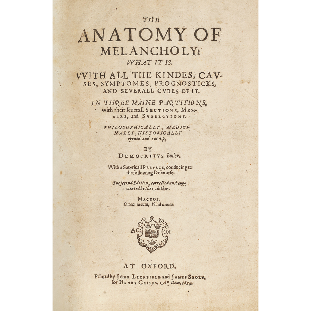 The Anatomy of Melancholy. Oxford: John Lichfield and James Short for Henry Cripps, 1624. Second edition, folio, early twentieth century calf, gilt, spine gilt, red morocco label of W.A. Foyle, Beeleigh Abbey, joints splitting, hinges weak & repaired