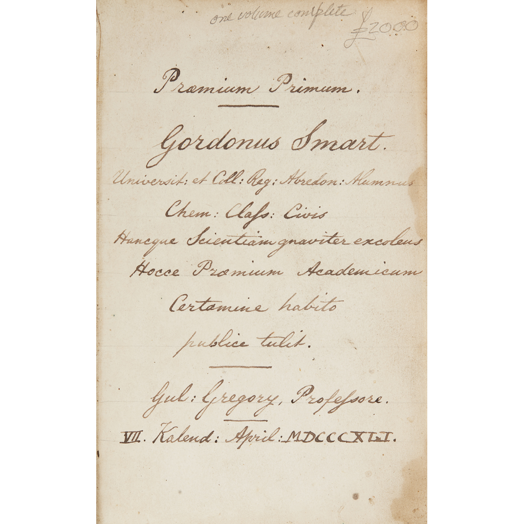 Experimental Researches in Electricity... reprinted from the Philosophical Transactions of 1831-1838. London: R. & J.E. Taylor, 1839. First edition, 8vo, 8 folding plates, contemporary calf gilt with gilt stamp of The University and King's College of Aberdeen, initial blank leaf with 1841 Aberdeen University award inscription [not from Faraday] to G. Smart, plates and margin of title slightly dampstained
