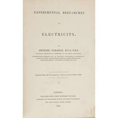 Note: "Between 1832 and 1852 Faraday published twenty-nine series of papers in the Philosophical Transactions under the title "Experimental researches in electricity"; it was through these papers that his major discoveries relating to electricity and magnetism were first published. These papers, along with pertinent papers and letters published in other scientific journals, were collected in three volumes published in 1839, 1844 and 1855. " (PMM).