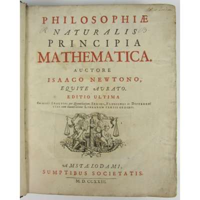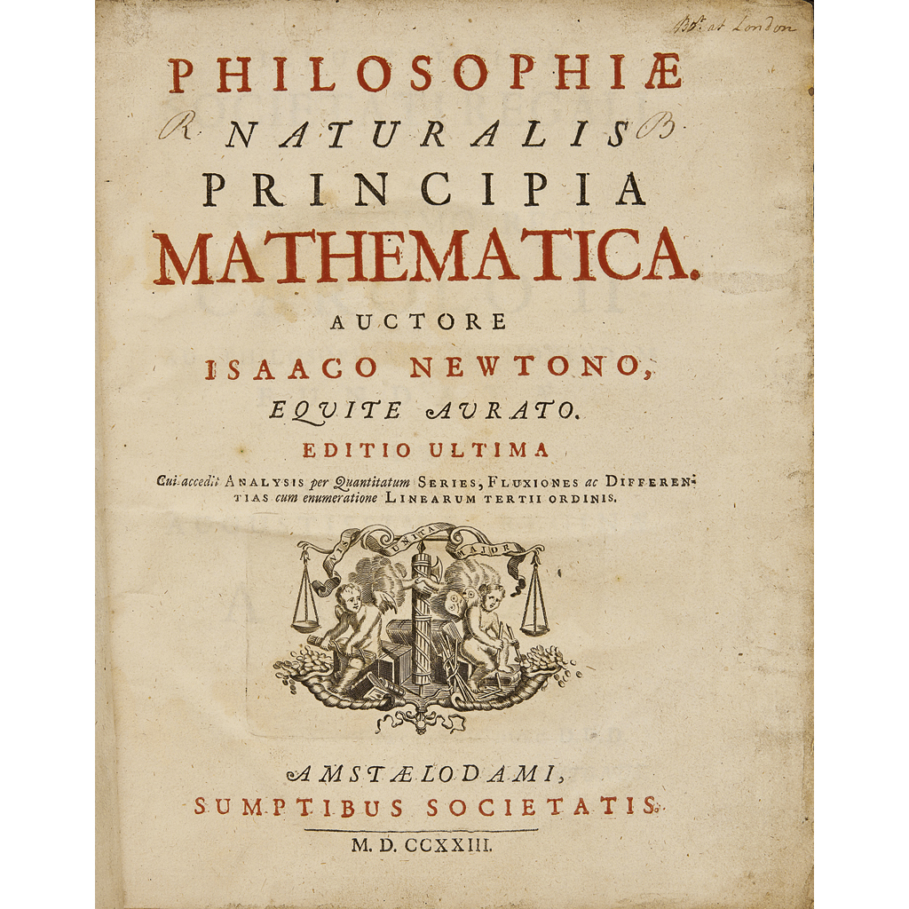 Philosophiæ Naturalis Principia Mathematica... Amsterdam: Sumptibus Societatis, 1723. 4to, second Amsterdam edition, 2 parts in one volume, title-page in red and black, 3 folding tables, contemporary calf, rebacked retaining contemporary spine, small ownership signature in an early hand to title-page, occasional annotations in a small and neat early hand, some light dampstaning throughout, some rubbing to covers and spine