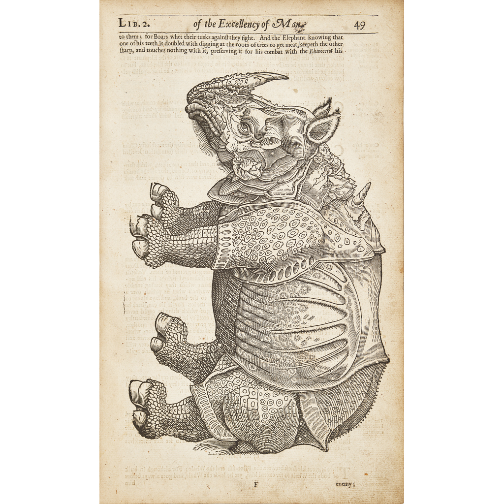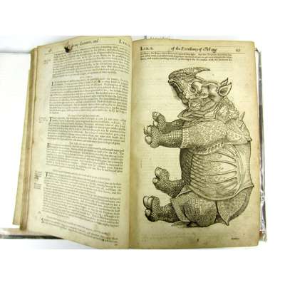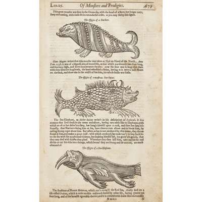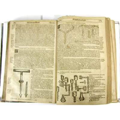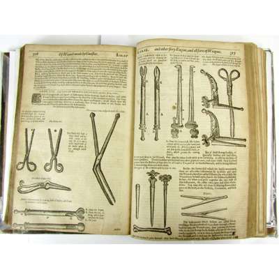 The Workes of that famous Chirurgion Ambrose Parey. [London: for J. Clarke, 1649]. Folio, numerous woodcuts in text, 18th century half calf, lacks title, 2 folding plates, the first 3 leaves, and pp. 589-594, some soiling and staining, a few short tears, F3 with some loss of text, worn, covers detached