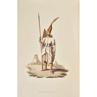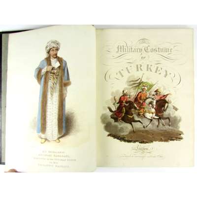 The Military Costume of Turkey. London: Thomas McLean, 1818. First edition, folio (360 x 260mm.), half title, hand-coloured engraved frontispiece, pictorial title and 29 hand-coloured aquatint plates by John H. Clark after Dalvimart, some plates watermarked J. Whatman 1817 and one 1804, contemporary blue full straight grained morocco gilt, slightly raised bands to elaborately gilt spine, triple gilt rule borders enclosing floral gilt design and blind border, a.e.g.