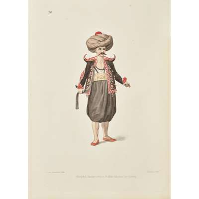 The Costume of Turkey. London: William Miller, 1802 [but c.1818], folio (370 x 270mm.), printed title with hand-coloured engraved vignette, 60 hand-coloured engraved plates, additional title in French, accompanying text in English and French, (some plates watermarked 1817 & 1818, one leaf of text 1811), blue full straight grained morocco gilt, spine with raised bands gilt in compartments, gilt title direct to spine, boards with elaborate gilt floral border enclosing border in blind and gilt, gilt dentelles, a.e.g., frontispiece offset onto title, most plates offset onto text, extremities rubbed