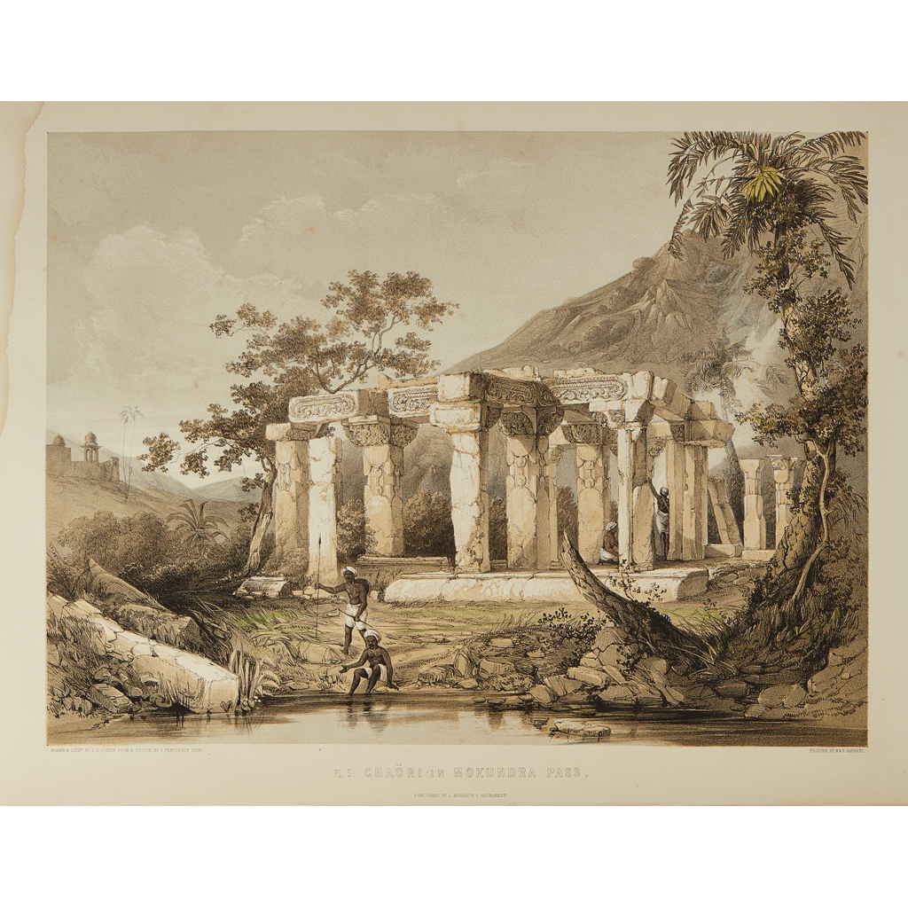 Picturesque Illustrations of Ancient Architecture in Hindostan. London: J Hogarth, 1847. Folio. 1 lithographed title. 23 tinted lithographed plates. 1 map, contemporary half morocco gilt, uper cover detached from text block, damp staining to lower part of plates and some pages, some foxing and browning, some rubbing and damp staining to covers