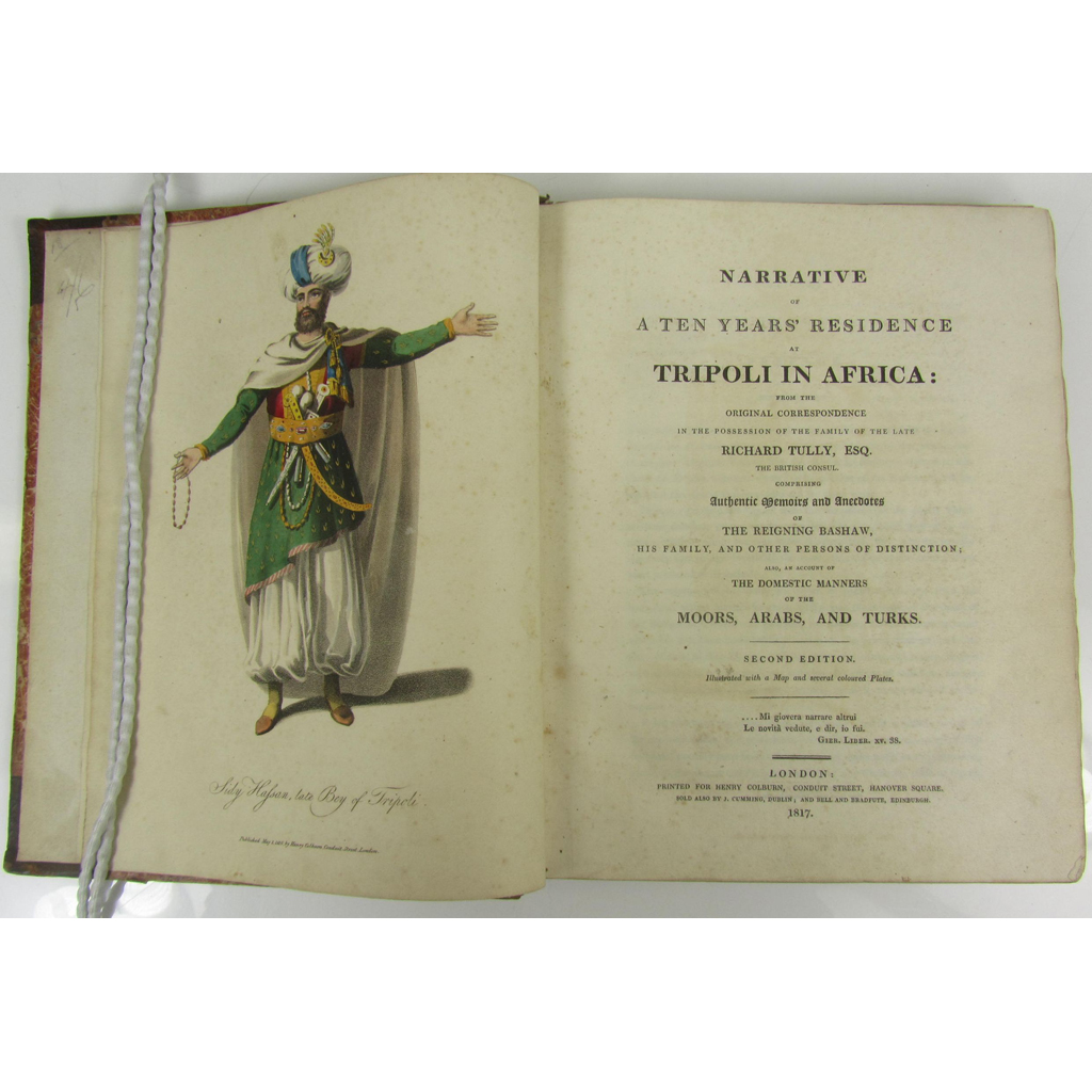 Narrative of a Ten Years' Residence at Tripoli in Africa. London: H. Colburn, 1817. Second edition., 4to., folding map and 7 hand-coloured aquatint plates, contemporary half calf, occasional light spotting, joints split, binding somewhat worn, hinges strengthened