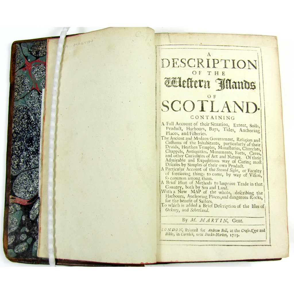 A Description of the Western Islands of Scotland. London: A. Bell, 1703. First edition, 8vo, folding map (tear repaired) and folding plate, contemporary panelled calf, head of title excised, very small "Selbourne Library" stamp on title verso, slightly spotted, rebacked, corners rubbed