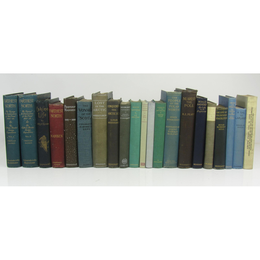 Nansen, Fridtjof Farthest North. Westminster: Archibald Constable and Company, 1897. 2 volumes, 8vo, portrait, frontispiece, 4 folding maps (one torn), original green cloth gilt; [Idem] Eskimo Life. London: Longmans, Green, and Co., 1893. 8vo, original green cloth gilt; [Idem] Farthest North. London: Archibald Constable and Co. Ltd., 1904. 8vo, original red cloth gilt; Brögger, W.C. and Rolfsen, Nordahl Fridtjof Nansen. London: Longmans, Green, and Co., 1896. 8vo, original green cloth; [Brown, R.N.R, and others] The Voyage of the "Scotia". Edinburgh & London: William Blackwood and Sons, 1906. 8vo, folding map, later? cloth; Peary, R.E. Nearest the Pole. London: Hutchinson & Co., 1907. 8vo, original black cloth gilt, 2 folding maps; Mikkelsen, Ejnar Conquering the Arctic Ice. London: William Heinemann, 1909. 8vo, original green cloth with Polar bear motif; [Idem] Lost in the Arctic... London: William Heinemann, 1913. 8vo, folding map, original green cloth, silver rubbed from covers; and 12 others, sold not subject to return (21)