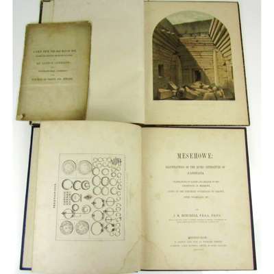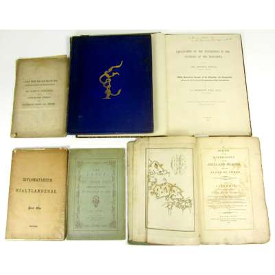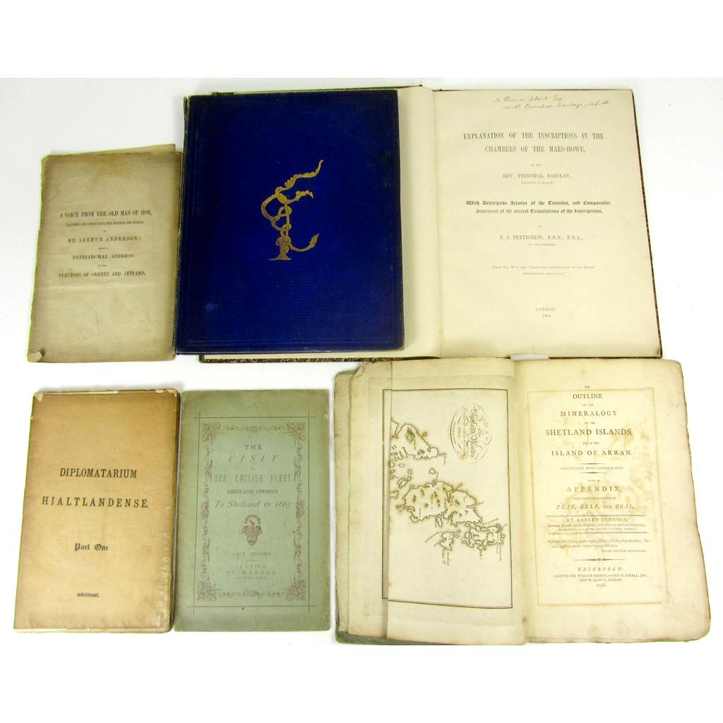 Pettigrew, T.J. Explanation of the Inscriptions in the Chambers of the Maes-Howe. London, 1863. First edition, 4to., 4 plates, 1 coloured, quarter maroon morocco, rubbed; Mitchell, J.M. Mesehowe: Illustrations of the Runic Literature of Scandinavia. Edinburgh, 1863. 4to., frontispiece and 8 plates, original pictorial blue cloth gilt, dampstain in inner lower margin, a few spots, binding slightly soiled, small tear at head of upper joint; Jameson, Robert An Outline of the Mineralogy of the Shetland Islands. Edinburgh, 1798. First edition, 8vo, presentation copy to John Bell, inscribed on title verso, 2 (of 3) maps, 1 folding, original boards, uncut, worn, lacks spine, one cover detached; Anderson, Arthur A Voice from the Old Man of Hoy. 8vo, sewn as issued, rubbed, outer leaves lightly dust-soiled; [Shetland] The Visit of the English Fleet under Lord Sandwich to Shetland in 1665. Lerwick: T. Manson, [c.1880], 8vo, original wrappers; [Shetland] Diplomatarium Hialtlandense, documents relating to the Shetland Islands from the xiiith century. Lerwick: C. & A. Sandison, 1886. Part 1, 8vo, wrappers slightly rubbed (6)