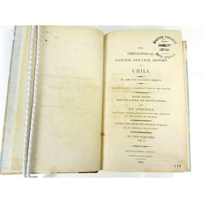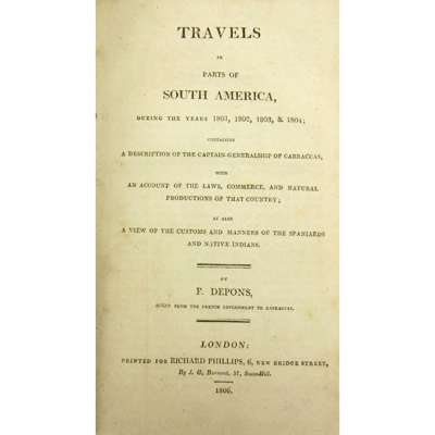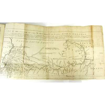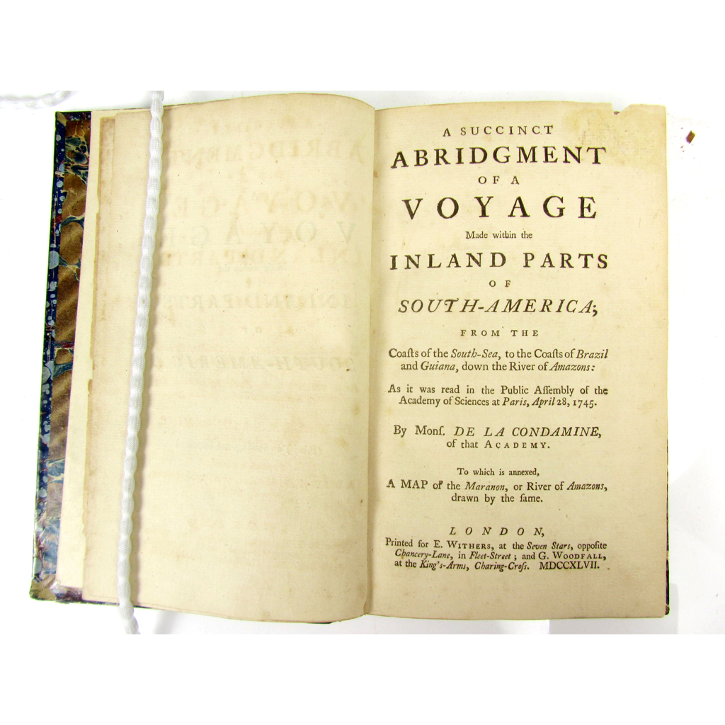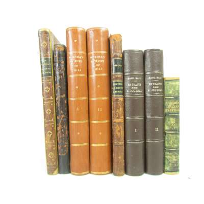 A Succint Abridgment of a Voyage made within the Inland Parts of South America. London: E. Withers & G. Woodfall, 1747. 8vo, folding map, half-title, late 19th century morocco-backed boards, light deletion from head of title, binding repaired, worn; Molina, J.I. The Geographical, Natural and Civil History of Chili. Middletown (Conn.), 1808. 2 volumes, 8vo, folding map, modern quarter brown morocco gilt, library stamp at head of title pages, occasional light spotting; Rengger & Longchamps, Messrs. The reign of Doctor Joseph Gaspard Roderick de Francia, in Paraguay. London, 1827. 8vo, contemporary half calf, somewhat spotted, rebacked retaining original spine; Conder, J. A Popular Description of Peru and Chile, [1830], 12mo, folding map and 3 plates, contemporary green half morocco; Hall, Basil Extracts from a Journal written on the Coasts of Chili, Peru and Mexico. Edinburgh, 1824. Second edition, 3 volumes, 8vo, folding map, modern quarter brown morocco; Depons, F. Travels in parts of South America in the years 1801-1804. London, 1806. 8vo, folding map & plan, early 20th century calf-backed boards, plan split at fold, short split to map, rubbed (8)