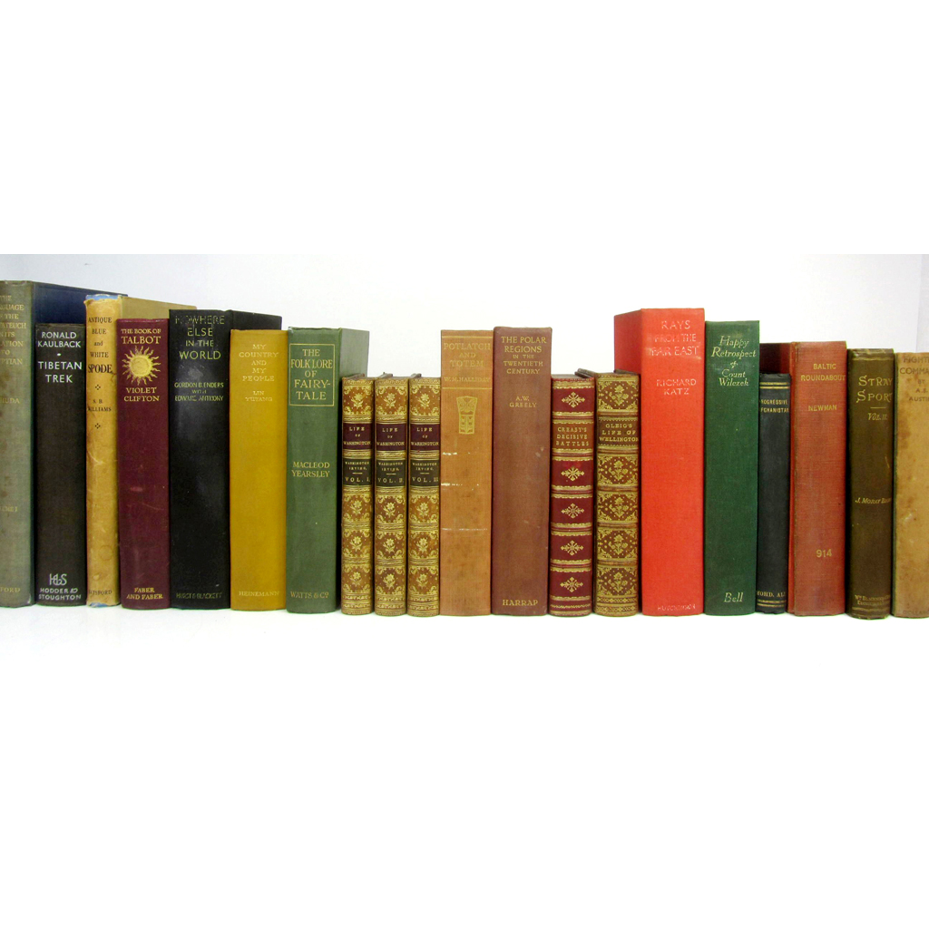 Yearsley, M. The Folklore of Fairy-Tale. 1924; Enders, G.B. Nowhere Else in the World. 1936; Halliday, W.M. Potlatch and Totem. [n.d.]; Kaulback, R. Tibetan Trek. 1934; Yutang, L. My Country and my People. 1936; Irving, Washington Life of George Washington. 1855. 3 volumes, 8vo, half calf; Williams, S.B. Antique Blue and White Spode. 1943, 4to., dustwrapper; Greely, A.W. The Polar Regions in the Twentieth Century. 1929, binding damp-soiled; Clifton, V. The Book of Talbot. 1933; Yahuda. A.S. The Language of the Pentateuch. 1933, volume 1 (all published), most original cloth, some bindings faded or spotted; and 27 others (39)