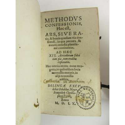 Methodus Confessionis... Dillingen: Sebald Mayer, Christophorus Schick, 1560. 12mo, contemporary stamped pigskin, clasps (upper clasp broken) some initial worming slightly affecting text, old library ticket to spine, stamp of Buxheim library to title-page, some annotations in an early hand [USTC 675849]