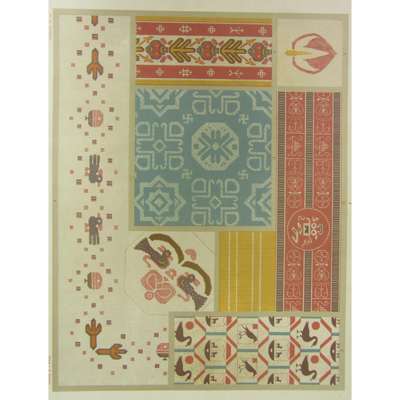 Ornament of Textile Fabrics. London: B. Quaritch, [1882]. Folio, 2 parts (text in original wrappers, plates loose in worn cloth portfolio), 160 colour printed plates on textured paper, upper and lower board only, lacking spine, library blindstamp to plate and text margins; Jones, Owen The Grammar of Ornament. London: B. Quaritch, 1868. Folio, 109 chromolithograph plates, brown half morocco, library blindstamp to foot of chromolithographed title, final plate and printed title, no other library stamps, hinges weak, worn (3)