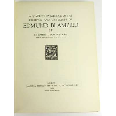 A Complete Catalogue of the Etchings and Dry-Points of Edmund Blampied R.E. London: Halton & Truscott Smith, 1926. 4to, number 54 of 350 copies with frontispiece signed by Blampied, 61 individual leaves of etchings and 16 other leaves of images, original cloth