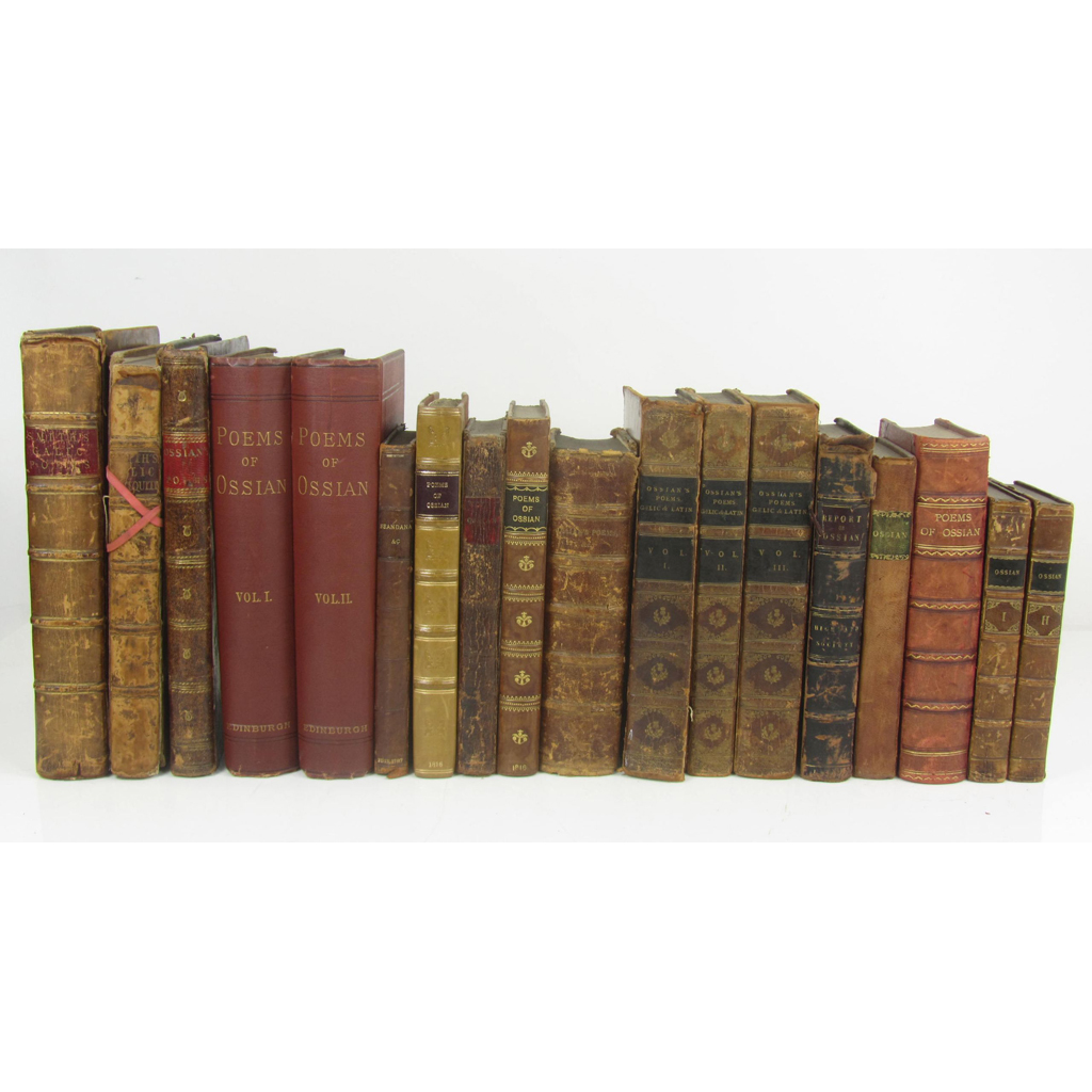 Temora, an Ancient Epic Poem... together with several other poems, composed by Ossian, the Son of Fingal... london, 1763. 4to, contemporary calf, facsimile title-page; Smith, John Galic Antiquities... Edinburgh, 1780. 4to, contemporary calf, coves detached, title-page torn; Smith, John Sean Dana le Oisian, Orran, Ulann, &c. [Ancient Poems of Ossian, Orran, Ullin &c.] Edinburgh: Charles Elliot, 1787. 4to, contemporary calf; Macpherson, James The Poems of Ossian... Edinburgh, 1792. 8vo, new edition, contemporary calf; Mackenzie, Henry Report of the Committee of the Highland Society of Scotland, appointed to inquire into the nature and authenticity of the Poems of Ossian. Edinburgh, 1805. 8vo, contemporary half calf; [Macpherson, James] The Poems of Ossian, in the original Gaelic, with a translation into Latin. London, 1807. 3 volumes, 8vo, contemporary calf, worn; Graham, Patrick Essay on the Authenticity of the Poems of Ossian... Edinburgh, 1807. 8vo, contemporary half calf; McCallum, Hugh & John, editors An Original Collection of the Poems of Ossian... Montrose, 1816. 8vo, later half calf; Ossian Dana Oisin Mhic Fhinn... Edinburgh, 1818. 8vo, contemporary calf; and 7 others, sold not subject to return (18)