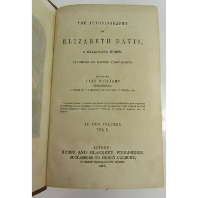 The Autobiography of Elizabeth Davis, a Balaclava Nurse... London: Hurst and Blackett, 1857. 2 volumes, first edition, 8vo, portrait, 24pp. of adverts, original brown cloth with gilt lettering to spines, bookplates of Sir Joseph Radcliffe, Rudding Park, some spotting throughout, covers rubbed, joints weak (2)