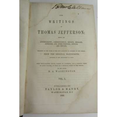 The Writings of Thomas Jefferson. Washington D.C., 1853-1854. 9 volumes, 8vo, portrait, charcoal cloth gilt, previous ownership signatures to title-pages, some light foxing and dampstaining, some wear and chipping to covers and spines (9)
