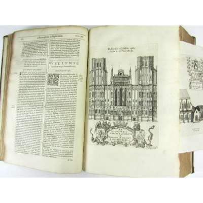 Monasticon Anglicanum. London: Richard Hodgkinson, 1655 [London: Aliciae Warren, 1661]. 2 volumes (of 3), 4to., engraved title in volume 1, and 71 engraved plates, titles printed in red and black, contemporary calf, one volume rebacked, one worn; [and] Stevens, John The History of the Antient Abbeys, Monasteries... being Two Additional Volumes to Sir William Dugdale's Monasticon Anglicanum. London, 1723. 2 volumes, 4to, 51 engraved plates, contemporary calf, rubbed, joints splitting, bookplates of Sir Stafford H. Northcote Bart. (4)