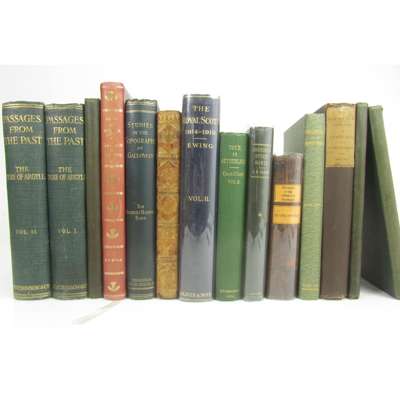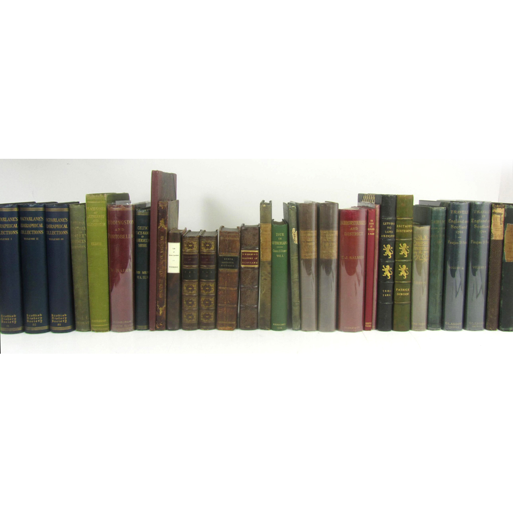 Rerum Scoticarum historia. Utrecht, 1668. 12mo, calf, joints split, repair to title verso; Drummond, W. The History of Scotland. 1681, engraved portraits, contemporary calf, neatly rebacked; Doddridge, P. Some Remarkable Passages in the Life of the Honourable Col. James Gardiner. Edinburgh, 1807. 12mo, modern quarter calf; Phipps, E.A. Memorials of Clutha. 1841. 8vo, lithographed plates, original cloth, slightly spotted, extremities worn; Lawson, J.P. The Comprehensive Gazetteer of Scotland. [c.1850]. 2 volumes, 8vo, plates, half calf; [Aberdeen, Earl of] Letters... addressed by contemporary statesmen to George, Earl of Aberdeen. 1851. 4to, modern half morocco gilt; Gordon, P. A Short Abridgement of Britane's Distemper. Aberdeen, 1844. 4to, modern green half morocco gilt; Stevenson, Thomas G., publisher The Edinburgh Topographical, Traditional and Antiquarian Magazine. 1849. 8vo, one of 250 copies printed, plates, half morocco, rubbed; Johnston, George The Botany of the Eastern Borders. 1853. 8vo, vol. 1 only, original cloth; [Burt, Edward] Letters from a Gentleman in the North of Scotland. 1822. 2 vol., original cloth; [Holyrood] Historical and Descriptive Account of the Palace and Chapel-Royal of Holyroodhouse. 1826. 4to, engraved title and 8 engraved plates, all in proof state on India paper, large paper copy, half cloth, margins somewhat spotted; Ellice, E.C. Place-Names of Glengarry and Glenquich. 1931. Presentation copy with A.L.S. tipped in, original cloth; Baird, W. Annals of Duddingston and Portobello. 1898, original cloth; Salmon, T.J. Borrowstounness and District. 1913, original cloth; Innerleithen Alpine Club Principal Excursions of the. 1895, 8vo, presentation copy from the club, original cloth; Polson, Alexander Gairloch. Dingwall, 1920, 8vo, original cloth; St John. C. A Tour in Sutherlandshire. 1884, 2 volumes, 8vo, original cloth; Faujas de Saint Fond, B. A Journey through England and Scotland to the Hebrides in 1784. 1907, 2 vol., 8vo, one of 450 copies, original cloth; and others, similar; sold not subject to return