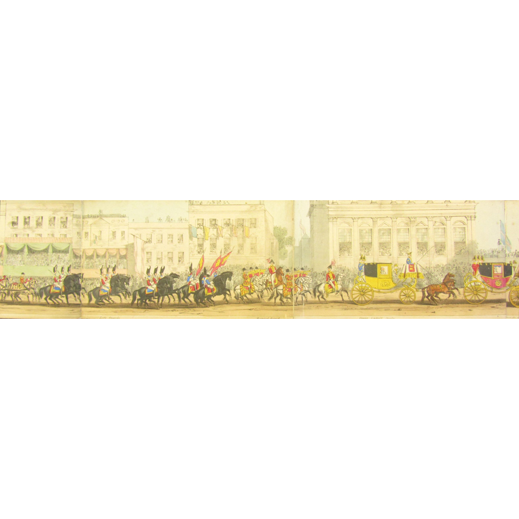 Tableau of the Procession at the Coronation of Queen Victoria, June 29, 1838, being an accurate Representation of that splendid Panorama. London: Robert Tyas, 1838. Folding hand-coloured aquatint panorama, 600cm x 11.6cm, folding into original green cloth covers, titled in gilt on upper cover, title label inside the front cover, covers a little worn at corners, strengthening verso at some folds, lacking c.20 cm of area, [not in Abbey]