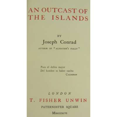 An Outcast of the Islands. London: T. Fisher Unwin, 1896. First edition, 8vo., original vertically-ribbed green cloth, spine lettered in gilt, top edge gilt, fore-edges uncut, minor abrasion to the binding