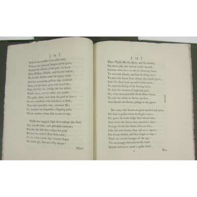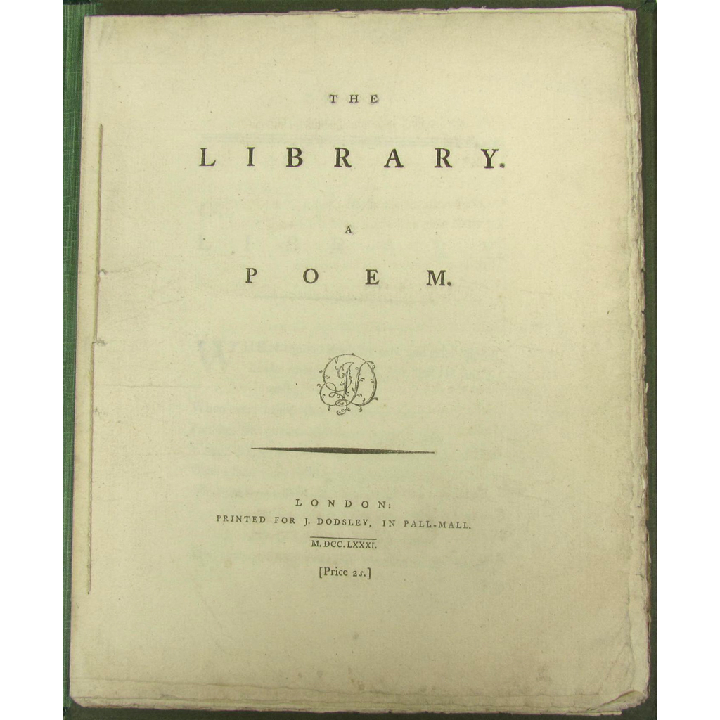 The Library. A Poem. London: Printed for J. Dodsley, 1781. First edition, 4to., 34pp. + final blank leaf, sewn as issued, uncut, green half morocco covers with cloth flaps, bookplates of Simon Nowell-Smith and Judith Adams Nowell-Smith, [ESTC T40881]
