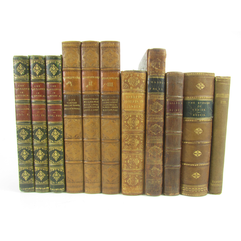 The Barnabys in America. London: Henry Colburn, 1843. First edition, 3 volumes, 8vo, 9 plates, green half calf gilt; Shakespeare, William The Plays. London: C. and J. Rivington..., 1826. 8volumes, 8vo, contemporary blind-stamped calf with gilt labels to spines; Pepys, Samuel Memoirs... comprising his Diary from 1659 to 1669... London: Henry Colburn, 1828. Second edition, 5 volumes, 8vo, contemporary red half morocco, bookplates, some browning, volume 1 covers a little wormed; [Ferrier, Miss] The inheritance. Edinburgh: William Blackwood, 1824. 3 volumes, 8vo, contemporary half calf, morocco gilt labels to spines; Butler, Samuel The Genuine Remains... London: J. and R. Tonson, 1759. 2 volumes, 8vo, contemporary calf; [Rowe, Elizabeth Singer] Friendship in Death... Dublin: Edward Exshaw, 1738. 8vo, part 2 dated 1835, contemporary calf; Beattie, James The Minstrel... London: John Sharpe, 1816. 12mo, attractive red morocco gilt; Byron Poems... London: Florence Press, Chatto & Windus, 1923. 8vo, number 20 of 260 copies on hand-made paper, original half Japanese vellum, bookplate; Bunyan, John The Pilgrim's Progress... London: Cassell & Co. Ltd. [n.d.] 8vo, 27 parts in original wrappers; Fleming, Ian The Spy Who Loved Me. London: Jonathan Cape, 1962. First edition, 8vo, original cloth, dust-jacket chipped and torn; and 18 others, sold not subject to return (70)