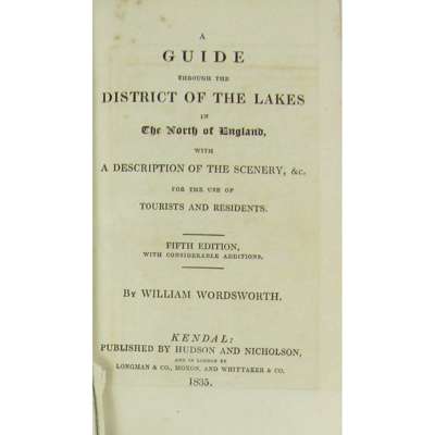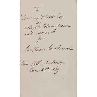 A Guide through the District of the Lakes in the North of England. Fifth Edition, with considerable additions. Kendal: Hudson & Nicholson, 1835. 12mo, presentation copy from the author, inscribed "To Thomas Thorp Esq. as a slight token of esteem and regard from William Wordsworth, Trin. Coll. Cambridge, June 4th 1839", folding engraved map, contemporary calf, spine gilt, single gilt fillet on sides, a trifle rubbed