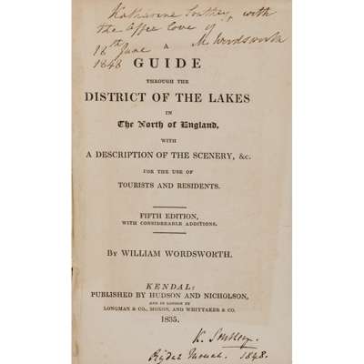 A Guide Through the District of the Lakes, in the North of England. Kendal: Hudson & Nicholson, 1835. Fifth edition, small 8vo, presentation copy inscribed at head of title page "Katharine Southey, with the affec. love of M. Wordsworth, 18th June 1848" and signed "K. Southey, Rydal Mount, 1848" at foot of title. Also inscribed on endpaper "Mary Stanger, Fieldside, May 1873, Given to me by Dr. Lietch", and inscribed in ink to the head of the front free endpaper "Bought at Miss Southey's sale at Laithewaite Cottage, August 1864, D.L., presented by Mrs Wordsworth to Miss Southey at Rydal Mount on the 18th June 1848", folding map (torn without loss), original purple cloth, remnants of printed paper title label to spine, cloth worn and faded, corners bumped and spine split with loss to lower bottom half