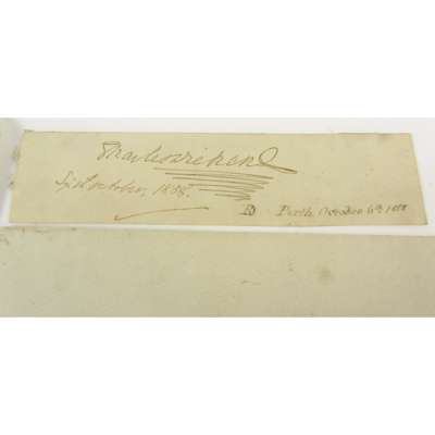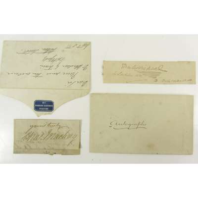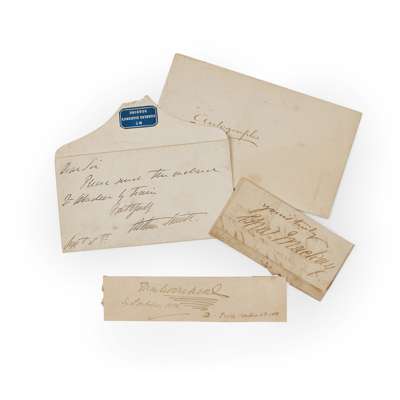 Autograph signature of Charles Dickens, dated Sixth October 1858, and also dated Perth October 6th 1858, on slip 12.5 x 3 cm.; Smith, Arthur, [Charles Dicken's Tour Manager], [Reading Ticket] Envelope inscribed "Dear Sir, Please send the enclosed to Aberdeen by Train, Faithfully, Arthur Smith, Sept 8th", envelope with blue printed motif on rear "Mr Charles Dickens's Readings"; Mackay, Arthur (1814-89; author and journalist who worked with Dickens on the Morning Chronicle and the Daily News) Clipped signature "Yours truly, Chas. Mackay", 4 x 9 cm., pasted onto a piece of paper