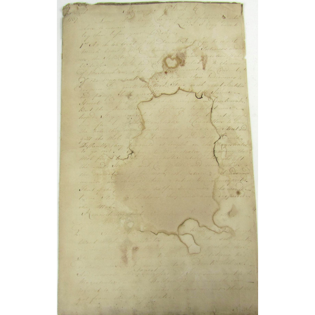 probably by Lord Polwarth, 7 pages, folio, 30th March 1737, headed "Magistrates of Edinburgh", "Lest there should be use for the following particulars tomorrow in the House of Lords, I beg leave to lay them before your Lordship", describing the "late trial of the drunk idiot (for he is not much better) McLauchlan as one of Porteous's murderers", the questioning of James Heriot and George Campbell, the role of the magistrates, the Solicitor General, the reporting to the Provost and Magistrates and Mr Lindsay of the whereabouts of Thomas Williamson, "one of the fellows who the night before had headed the mob that hanged Porteous" and their response, waterstained but mostly legible