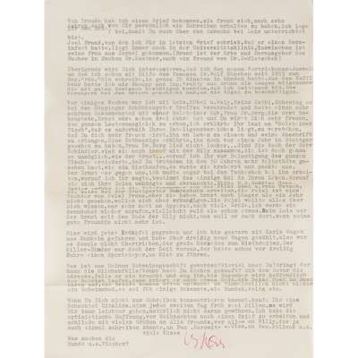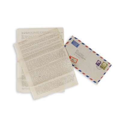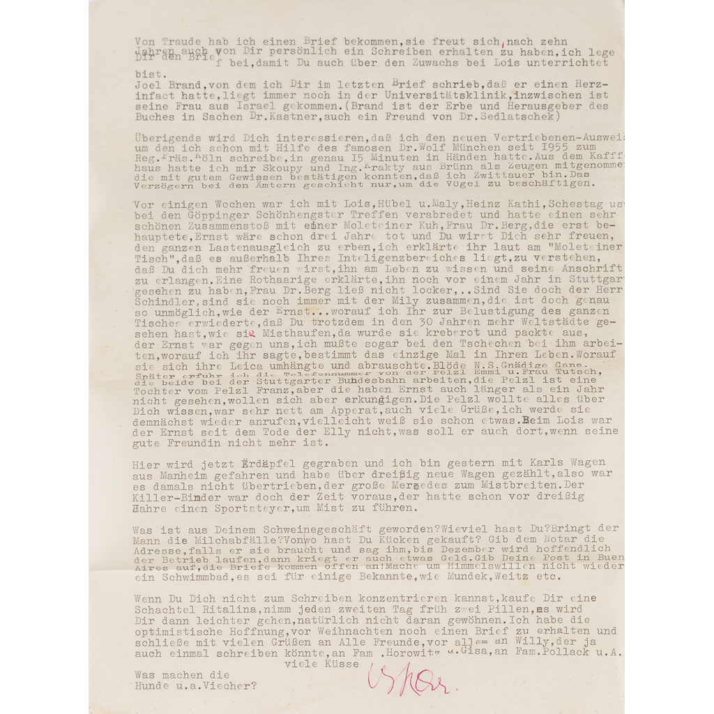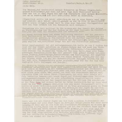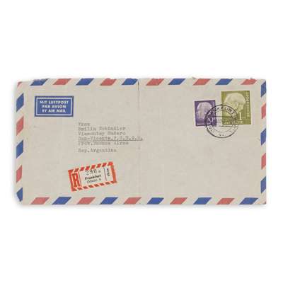 2pp. typed letter signed in red ink sent from Oskar Schindler to Emilie Schindler, dated Arndtstrasse 46, p. Frankfurt am Main, 8th October [19]57, each sheet 29 x 20.5cm, with franked airmail envelope addressed to Emilie Schindler in Buenos Aires