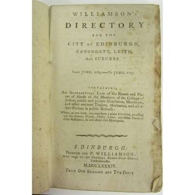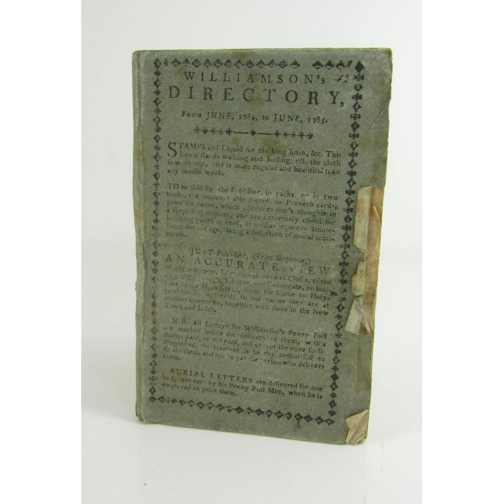 Williamson's Directory for the City of Edinburgh, Canongate, Leith and Suburbs, from June, 1784, to June, 1785. Edinburgh: Printed for P. Williamson and sold at his General Penny-Post Office, 1784. 12mo, comprising 120pp. (some leaves misbound) in original blue printed wrappers, in custom-made slipcase, wrappers a little foxed with some chipping